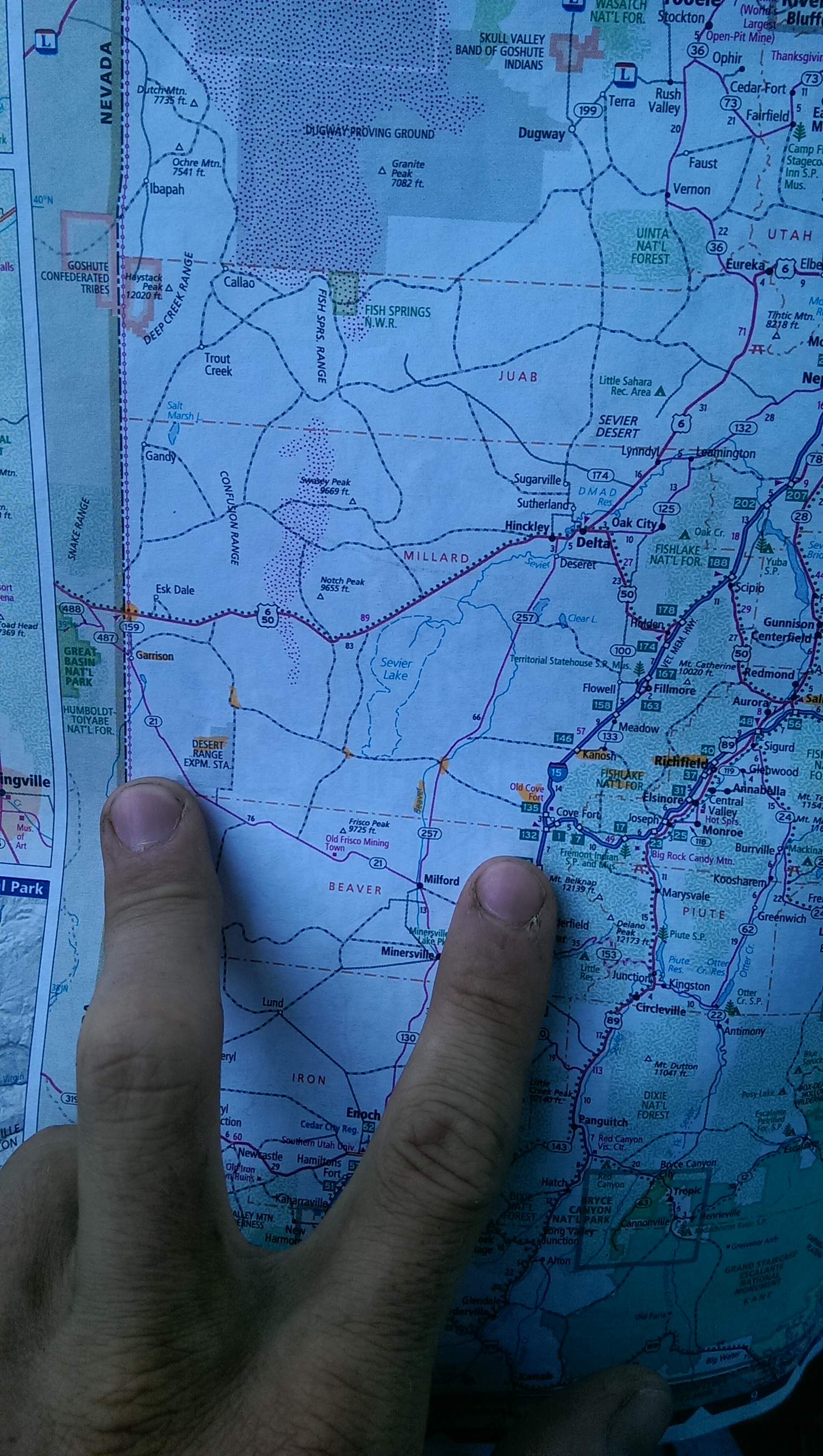 After some switchbacks we make it into town, what the locals call “Paradise, Utah.” The rest of the world knows it as Kanosh, if anyone knows it at all. We spent some time in the town there talking to the gas station/ auto repair shop owners. Great couple of guys that will make your day. They will take your mind off of the upcoming hundred miles of open desert. They described Utah as “the land of funny liquor laws, and funny underwear” (cause the mormons.)