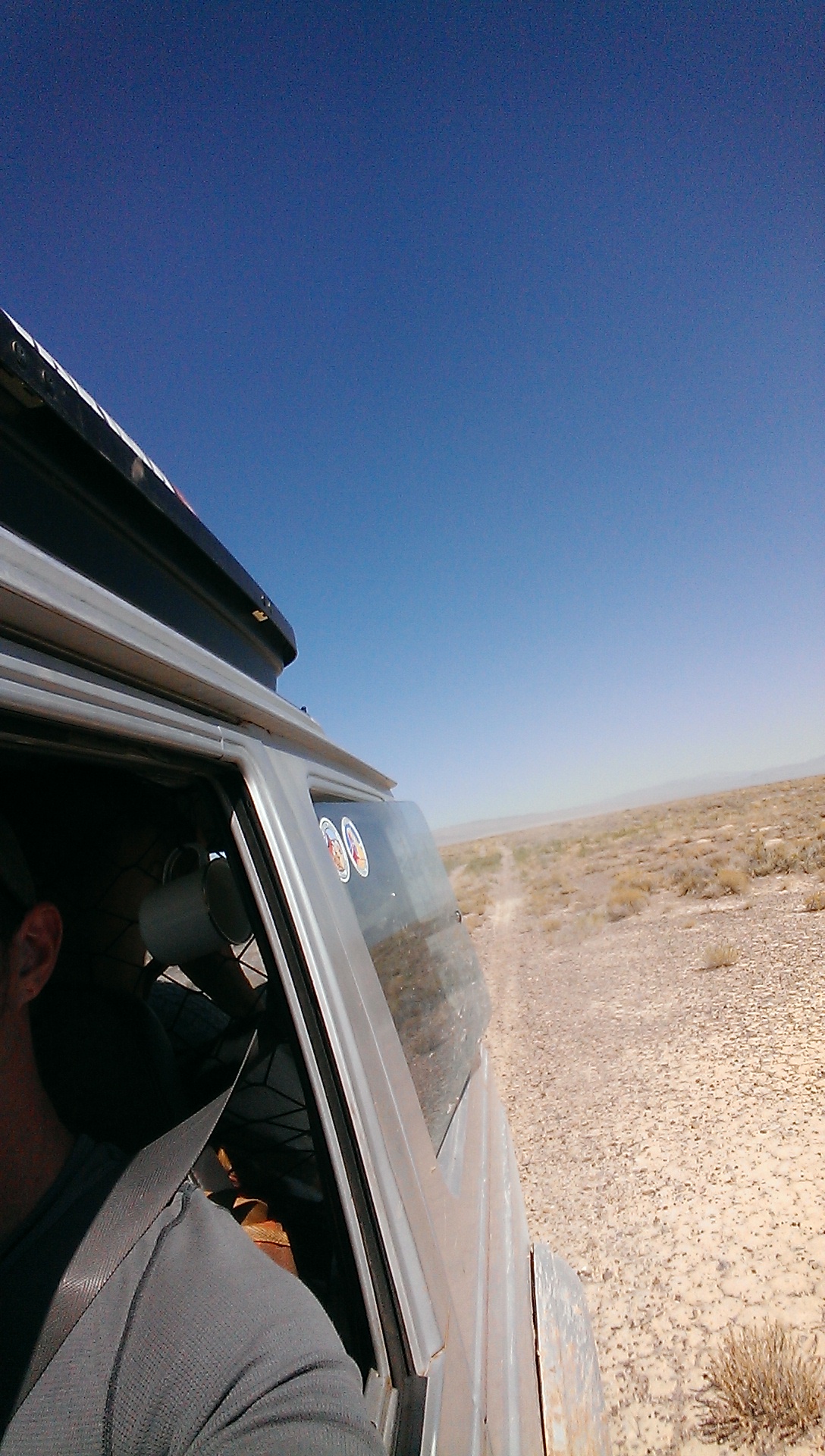 This part of the trip happens as we’re crossing the open desert separating Utah from Nevada. We later learn just how much open freaking desert is in Nevada as well. This actually worried me. I’ve watched enough “survivor man” to know what this sort of desert is like. And what it involves. In my head, the samurai was going to break down for the final time, and I would have to cut the seats apart and build a shelter with them or something. Actually a more real fear was the idea of running out of gas. This would also be the longest we’d be on the “road” without a gas station. I believe it was about 150 or so miles of no civilization. By that I mean not a sign of a human being, no farms or buildings, nothing but the dirt road in front of us. We can see the dry lake bed of Sevier Lake in the distance. Absurd amounts of dust and sand, and brush.